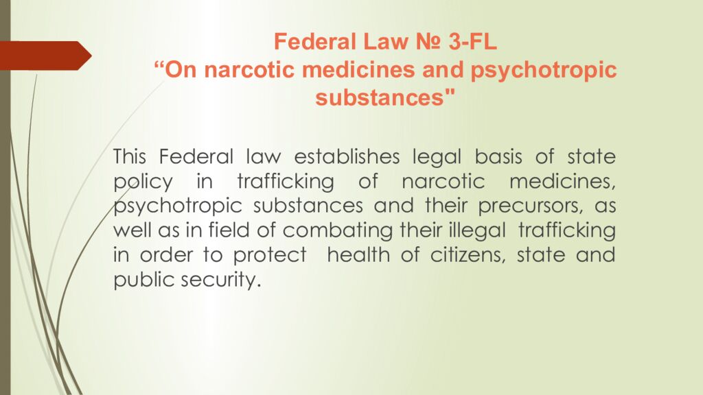 This Federal law establishes legal basis of state policy in trafficking of narcotic medicines, psychotropic substances and their precursors, as well as in field of combating their illegal trafficking in order to protect health of citizens, state and public security.