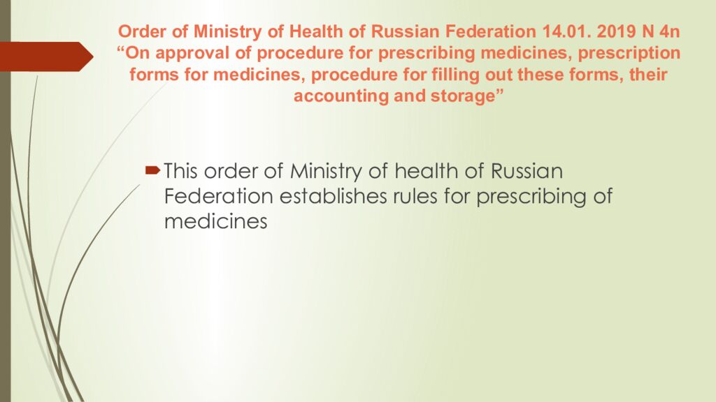 Слайд 15: Order of Ministry of Health of Russian Federation 14. 01. 201 9 N 4 n “On approval of procedure for prescribing medicines, prescription forms for medicines, procedure for filling out these forms, their accounting and storage”