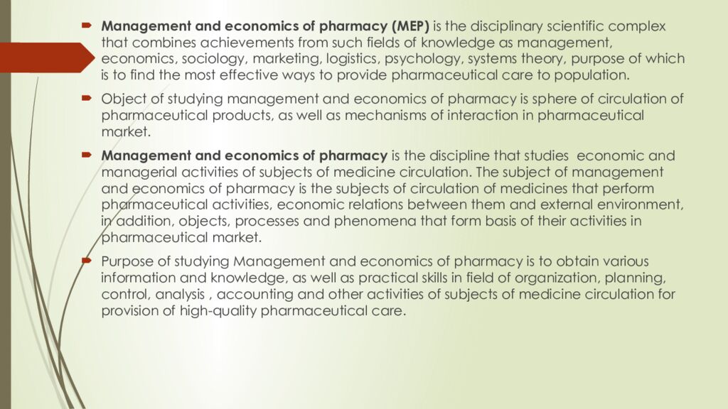 Management and economics of pharmacy (MEP) is the disciplinary scientific complex that combines achievements from such fields of knowledge as management, economics, sociology, marketing, logistics, psychology, systems theory, purpose of which is to find the most effective ways to provide pharmaceutical care to population. Object of studying management and economics of pharmacy is sphere of circulation of pharmaceutical products, as well as mechanisms of interaction in pharmaceutical market. Management and economics of pharmacy is the discipline that studies economic and managerial activities of subjects of medicine circulation. The subject of management and economics of pharmacy is the subjects of circulation of medicines that perform pharmaceutical activities, economic relations between them and external environment, in addition, objects, processes and phenomena that form basis of their activities in pharmaceutical market. Purpose of studying Management and economics of pharmacy is to obtain various information and knowledge, as well as practical skills in field of organization, planning, control, analysis, accounting and other activities of subjects of medicine circulation for provision of high-quality pharmaceutical care.