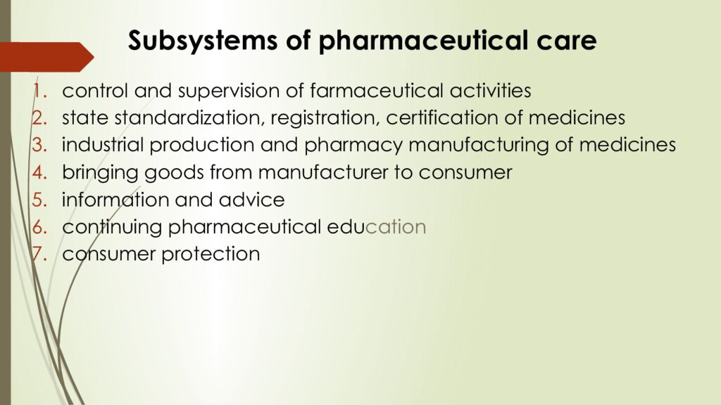 Subsystems of pharmaceutical care control and supervision of farmaceutical activities state standardization, registration, certification of medicines industrial production and pharmacy manufacturing of medicines bringing goods from manufacturer to consumer information and advice continuing pharmaceutical edu cation consumer protection
