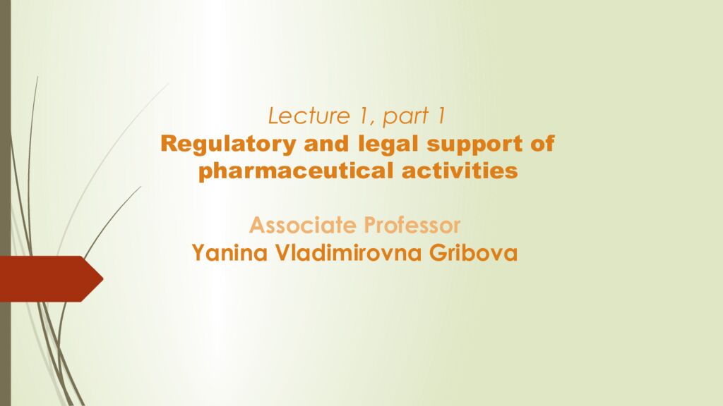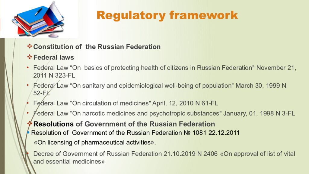 Constitution of the Russian Federation Federal laws Federal Law “On basics of protecting health of citizens in Russian Federation" November 21, 2011 N 323-FL Federal Law “On sanitary and epidemiological well-being of population " March 30, 1999 N 52-FL Federal Law “On circulation of medicines " April, 12, 2010 N 61-FL Federal Law “On narcotic medicines and psychotropic s ubstances" January, 01, 1998 N 3-FL Resolution s of Government of the Russian Federation Resolution of Government of the Russian Federation № 1081 22.12.2011 « On licensing of pharmaceutical activities ». Decree of Government of Russian Federation 21.10.2019 N 2406 « On approval of list of vital and essential medicines »
