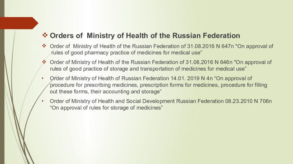 Orders of Ministry of Health of the Russian Federation Order of Ministry of Health of the Russian Federation of 31.08.2016 N 647n "On approval of rules of good pharmacy practice of medicines for medical use” Order of Ministry of Health of the Russian Federation of 31.08.2016 N 646n "On approval of rules of good practice of storage and transportation of medicines for medical use” Order of Ministry of Health of Russian Federation 14. 01. 201 9 N 4 n “On approval of procedure for prescribing medicines, prescription forms for medicines, procedure for filling out these forms, their accounting and storage” Order of Ministry of Health and Social Development Russian Federation 08.23.2010 N 706n “On approval of rules for storage of medicines”