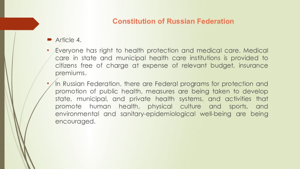 Article 4. Everyone has right to health protection and medical care. Medical care in state and municipal health care institutions is provided to citizens free of charge at expense of relevant budget, insurance premiums. In Russian Federation, there are Federal programs for protection and promotion of public health, measures are being taken to develop state, municipal, and private health systems, and activities that promote human health, physical culture and sports, and environmental and sanitary-epidemiological well-being are being encouraged.