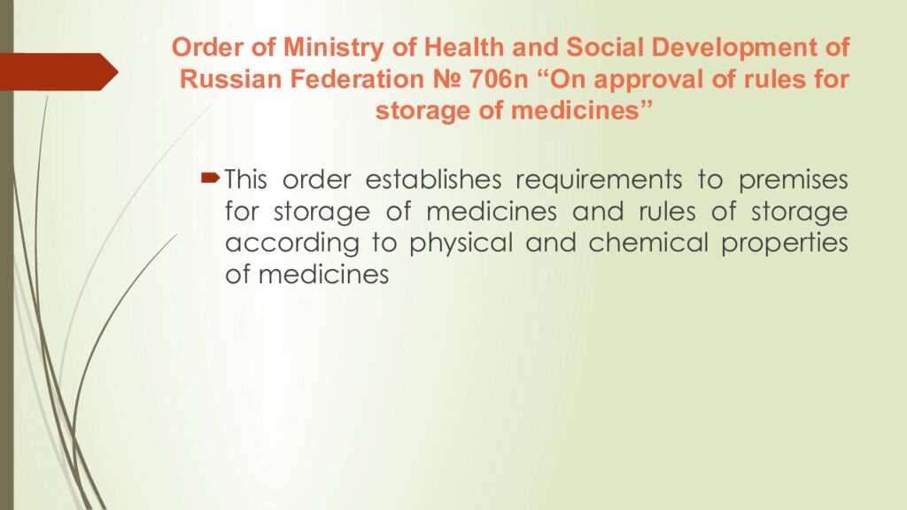 Слайд 16: Order of Ministry of Health and Social Development of Russian Federation № 706n “On approval of rules for storage of medicines”