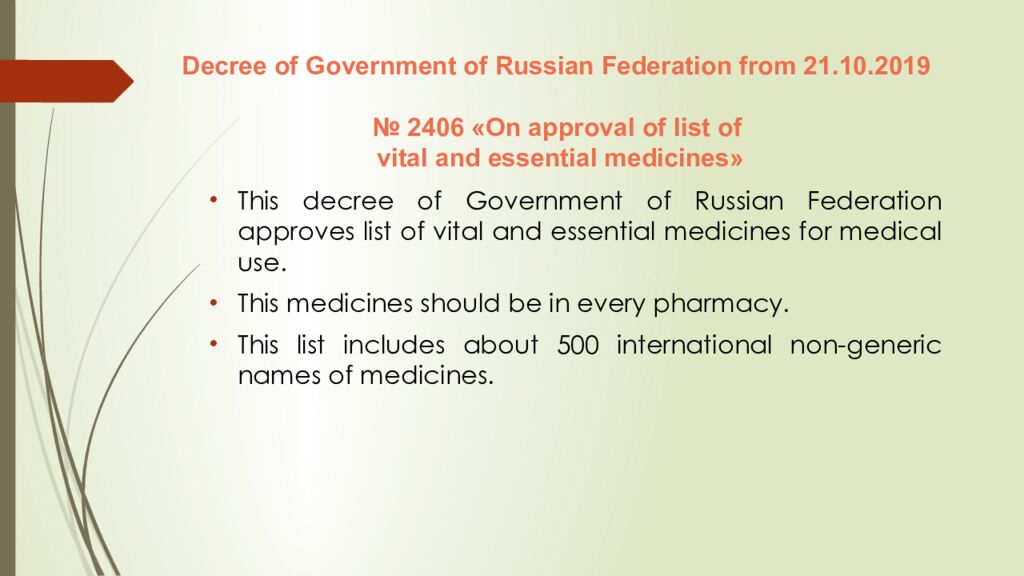 Слайд 14: Decree of Government of Russian Federation from 21.10.2019 № 2406 « On approval of list of vital and essential medicines »