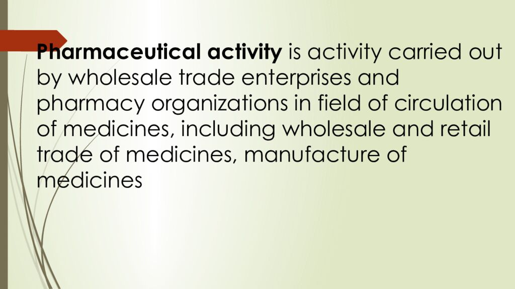 Pharmaceutical activity is activity carried out by wholesale trade enterprises and pharmacy organizations in field of circulation of medicines, including wholesale and retail trade of medicines, manufacture of medicines