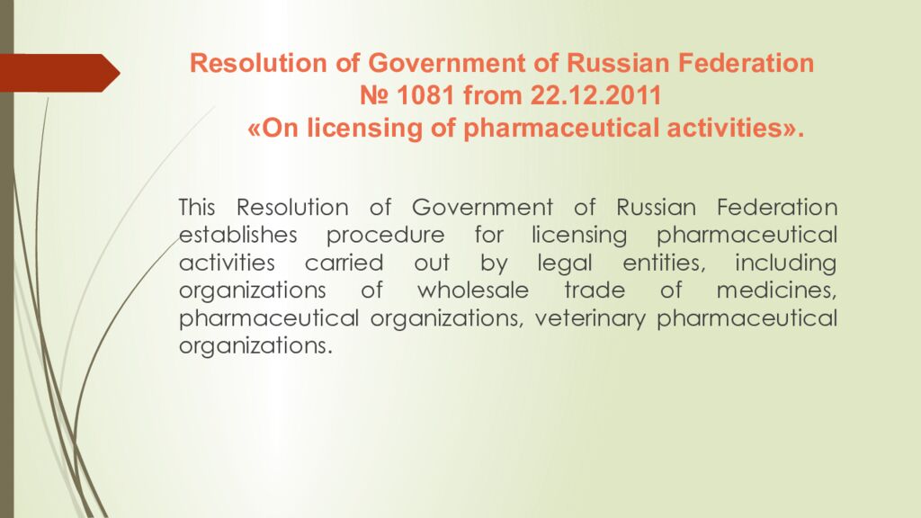 Слайд 13: Resolution of Government of Russian Federation № 1081 from 22.12.2011 « On licensing of pharmaceutical activities »