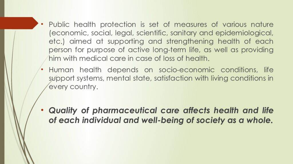 Public health protection is set of measures of various nature (economic, social, legal, scientific, sanitary and epidemiological, etc.) aimed at supporting and strengthening health of each person for purpose of active long-term life, as well as providing him with medical care in case of loss of health. Human health depends on socio-economic conditions, life support systems, mental state, satisfaction with living conditions in every country. Quality of pharmaceutical care affects health and life of each individual and well-being of society as a whole.