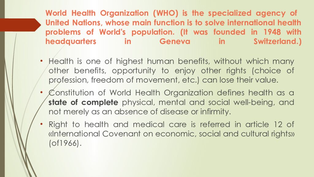 Health is one of highest human benefits, without which many other benefits, opportunity to enjoy other rights (choice of profession, freedom of movement, etc.) can lose their value. Constitution of World Health Organization defines health as a state of complete physical, mental and social well-being, and not merely as an absence of disease or infirmity. Right to health and medical care is referred in article 12 of « I nternational Covenant on economic, social and cultural rights » (of1966 ).