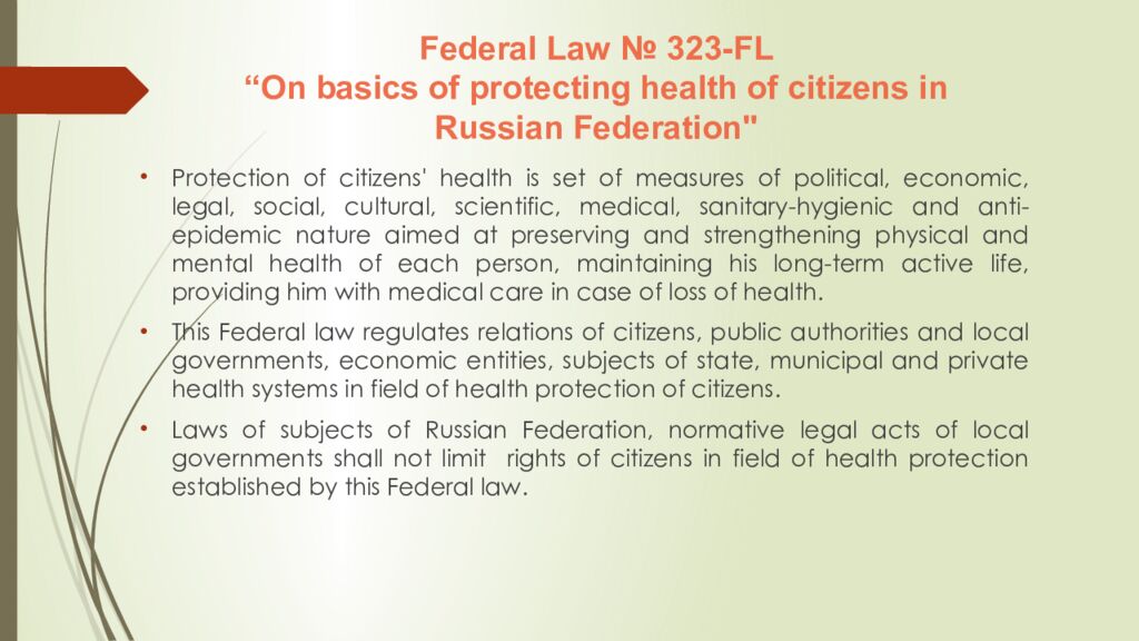 Protection of citizens' health is set of measures of political, economic, legal, social, cultural, scientific, medical, sanitary-hygienic and anti-epidemic nature aimed at preserving and strengthening physical and mental health of each person, maintaining his long-term active life, providing him with medical care in case of loss of health. This Federal law regulates relations of citizens, public authorities and local governments, economic entities, subjects of state, municipal and private health systems in field of health protection of citizens. Laws of subjects of Russian Federation, normative legal acts of local governments shall not limit rights of citizens in field of health protection established by this Federal law.