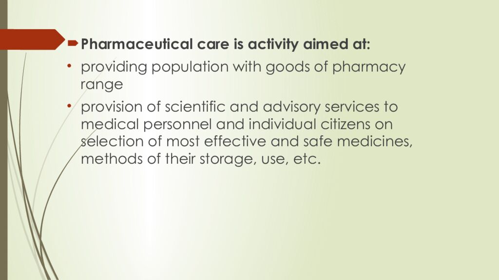 Pharmaceutical care is activity aimed at : providing population with goods of pharmacy range provision of scientific and advisory services to medical personnel and individual citizens on selection of most effective and safe medicines, methods of their storage, use, etc.