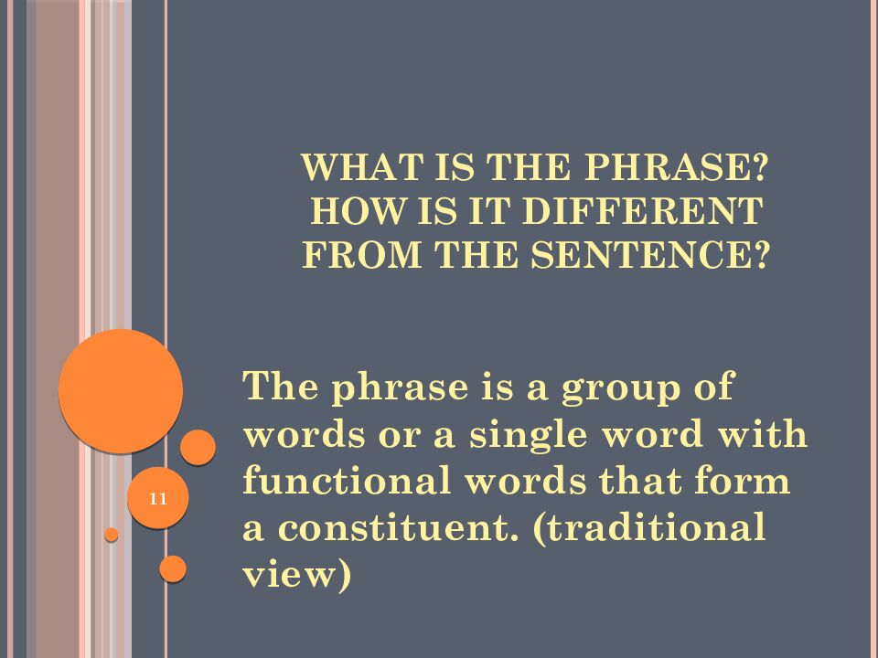 The phrase is a group of words or a single word with functional words that form a constituent. (traditional view) 11