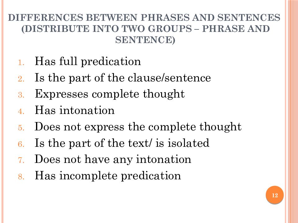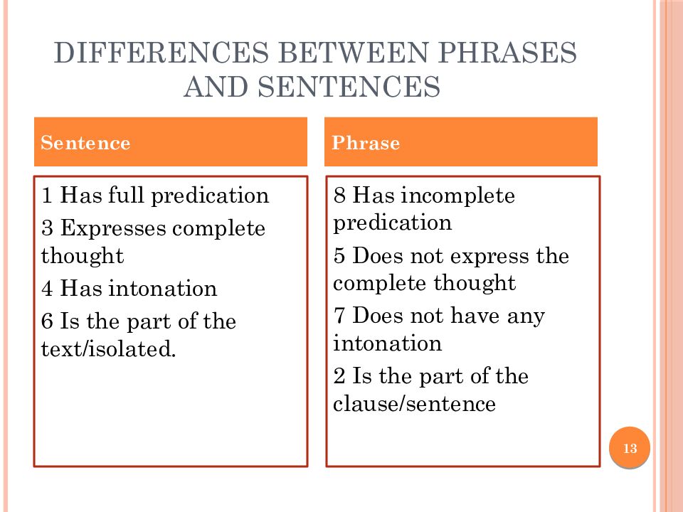 1 Has full predication 3 Expresses complete thought 4 Has intonation 6 Is the part of the text/isolated. 8 Has incomplete predication 5 Does not express the complete thought 7 Does not have any intonation 2 Is the part of the clause/sentence Sentence Phrase 13