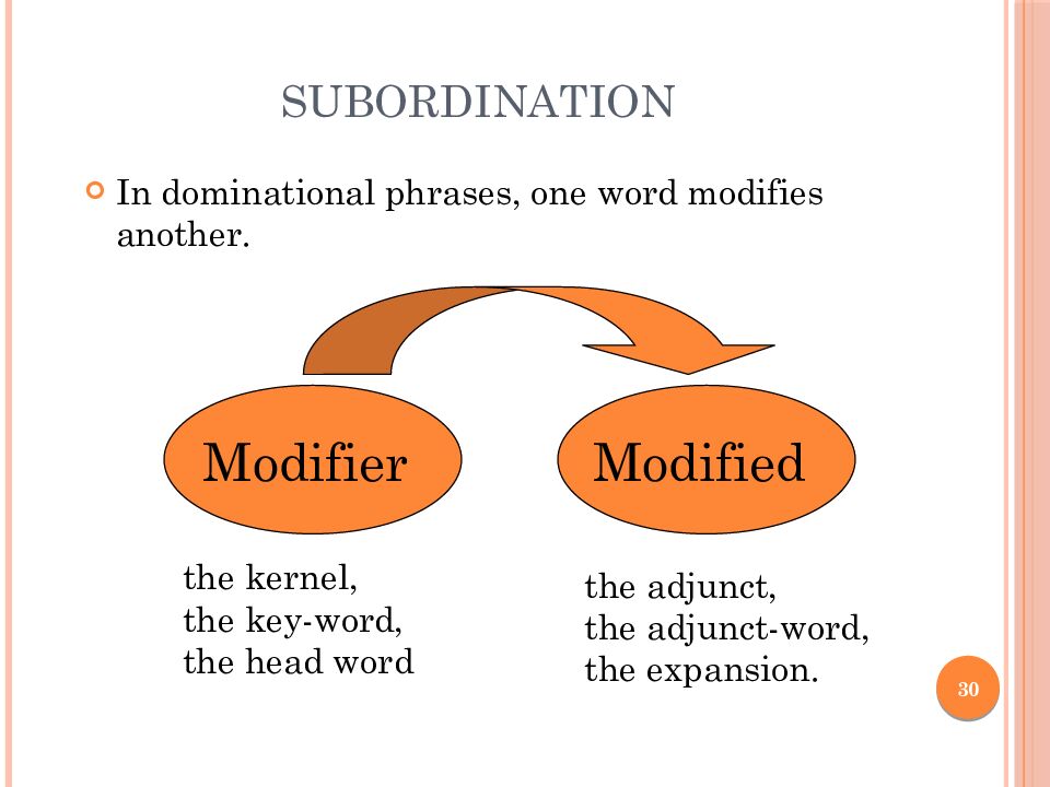 In dominational phrases, one word modifies another. Modifier Modified the kernel, the key-word, the head word the adjunct, the adjunct-word, the expansion. 30