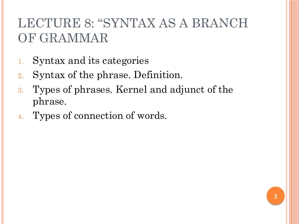 Syntax and its categories Syntax of the phrase. Definition. Types of phrases. Kernel and adjunct of the phrase. Types of connection of words. 2