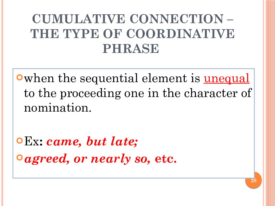Слайд 28: Cumulative connection – the type of coordinative phrase