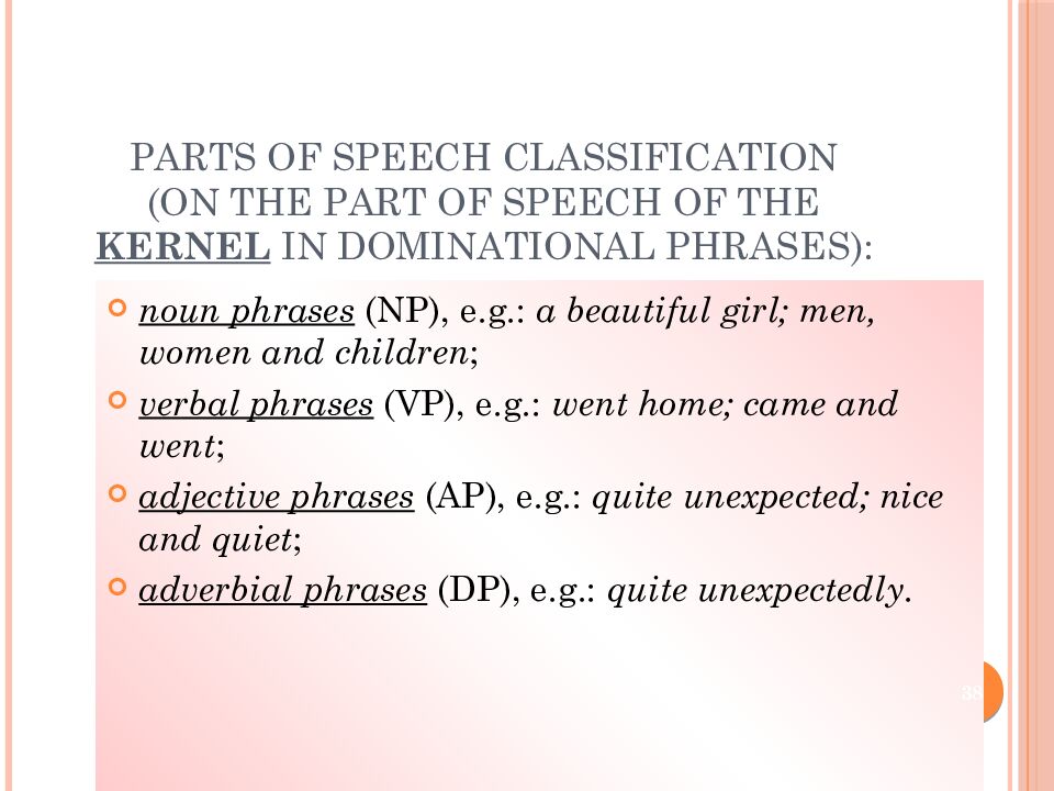 Слайд 38: Parts of speech classification ( on the part of speech of the kernel in dominational phrase s):