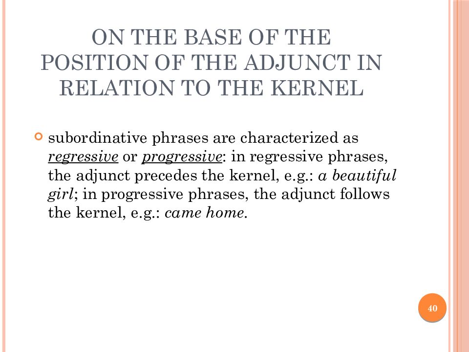 Слайд 40: On the base of the position of the adjunct in relation to the kernel
