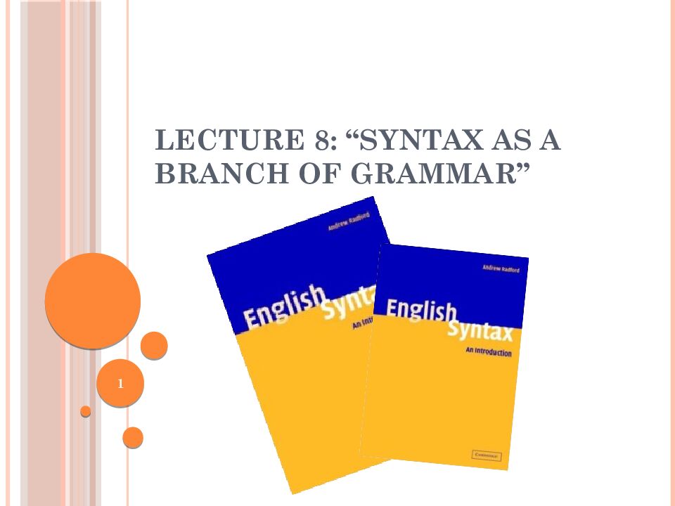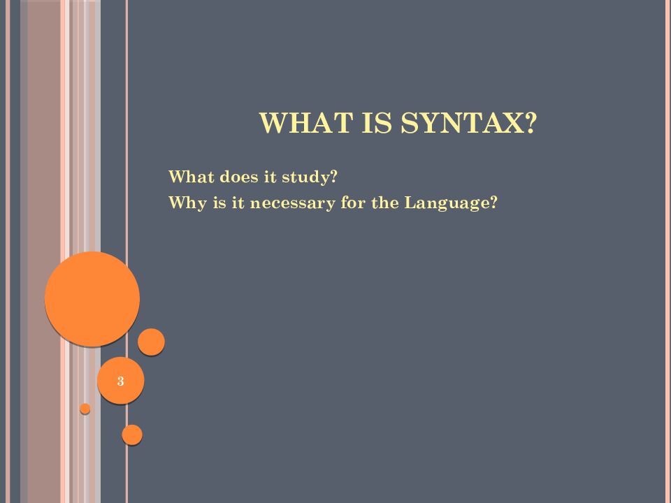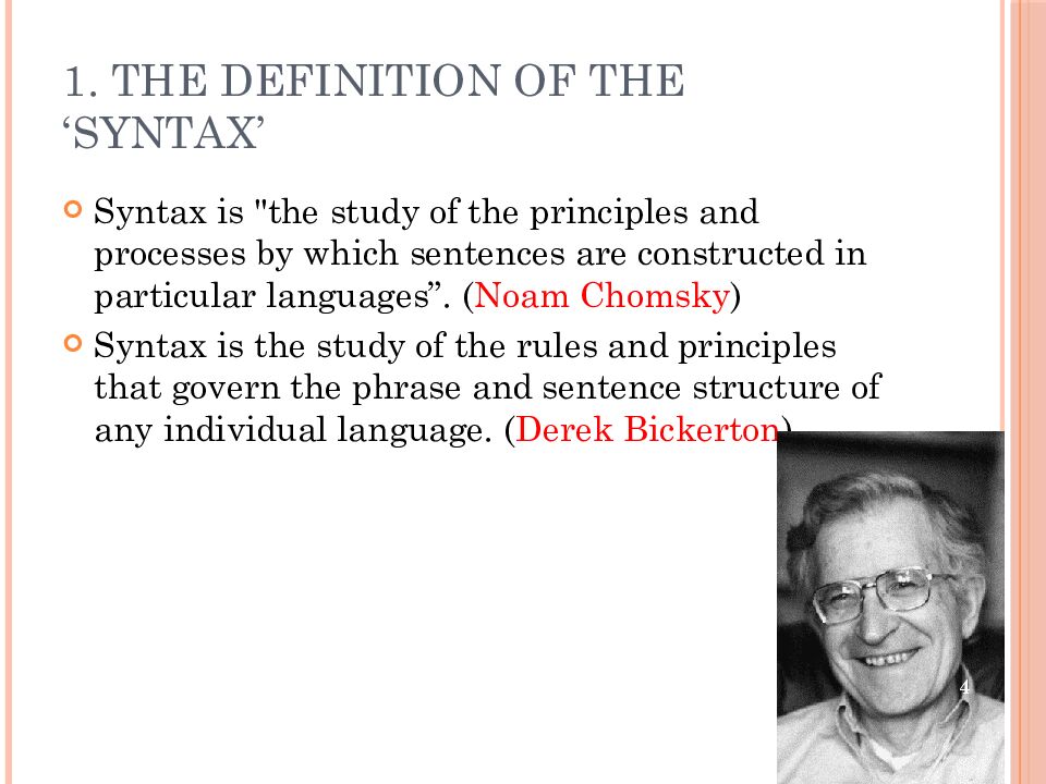 Syntax is "the study of the principles and processes by which sentences are constructed in particular languages”. ( Noam Chomsky ) Syntax is the study of the rules and principles that govern the phrase and sentence structure of any individual language. ( Derek Bickerton ) 4