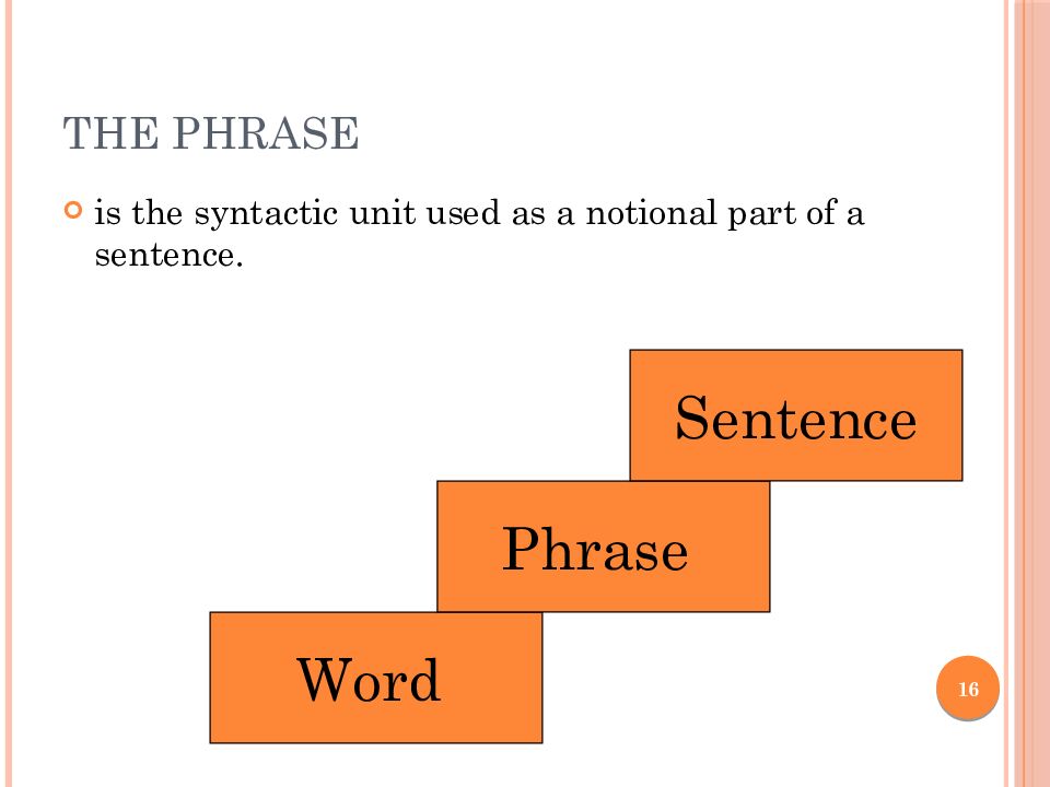 is the syntactic unit used as a notional part of a sentence. Word Phrase Sentence 16