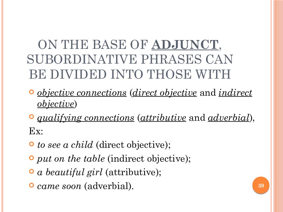 Слайд 39: On the base of adjunct, subordinative phrases can be divided into those with