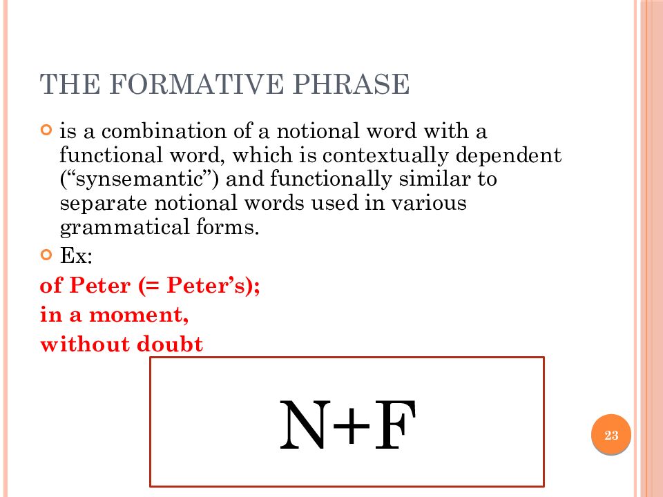 is a combination of a notional word with a functional word, which is contextually dependent (“ synsemantic ”) and functionally similar to separate notional words used in various grammatical forms. Ex : of Peter (= Peter’s ); in a moment, without doubt N+F 23