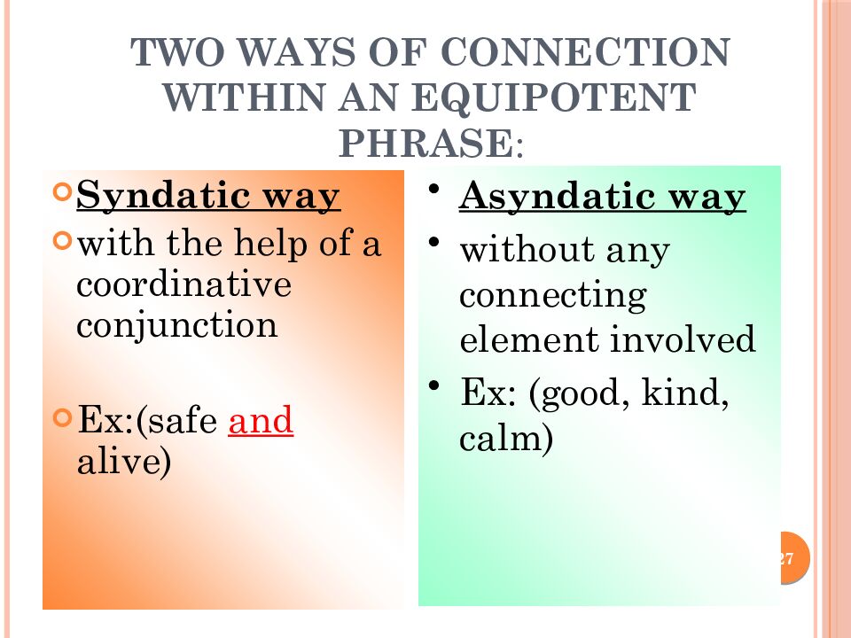 Syndatic way with the help of a coordinative conjunction Ex:(safe and alive) Asyndatic way without any connecting element involved Ex: (good, kind, calm) 27