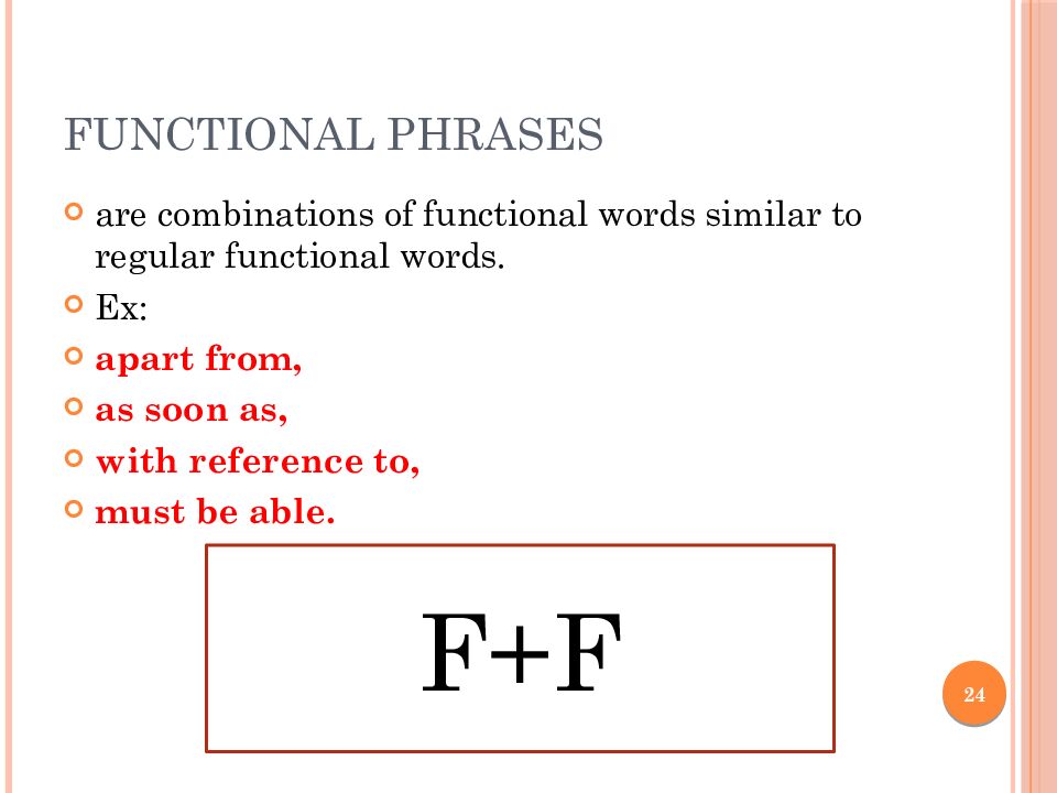 are combinations of functional words similar to regular functional words. Ex: apart from, as soon as, with reference to, must be able. F+F 24