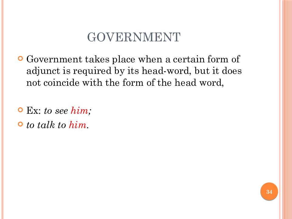 Government takes place when a certain form of adjunct is required by its head-word, but it does not coincide with the form of the head word, Ex : to see him ; to talk to him. 34