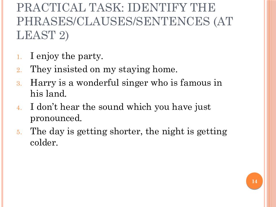 Слайд 14: Practical task: Identify the phrases/clauses/sentences ( at least 2 )