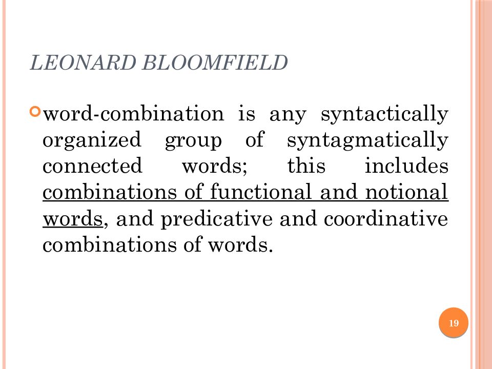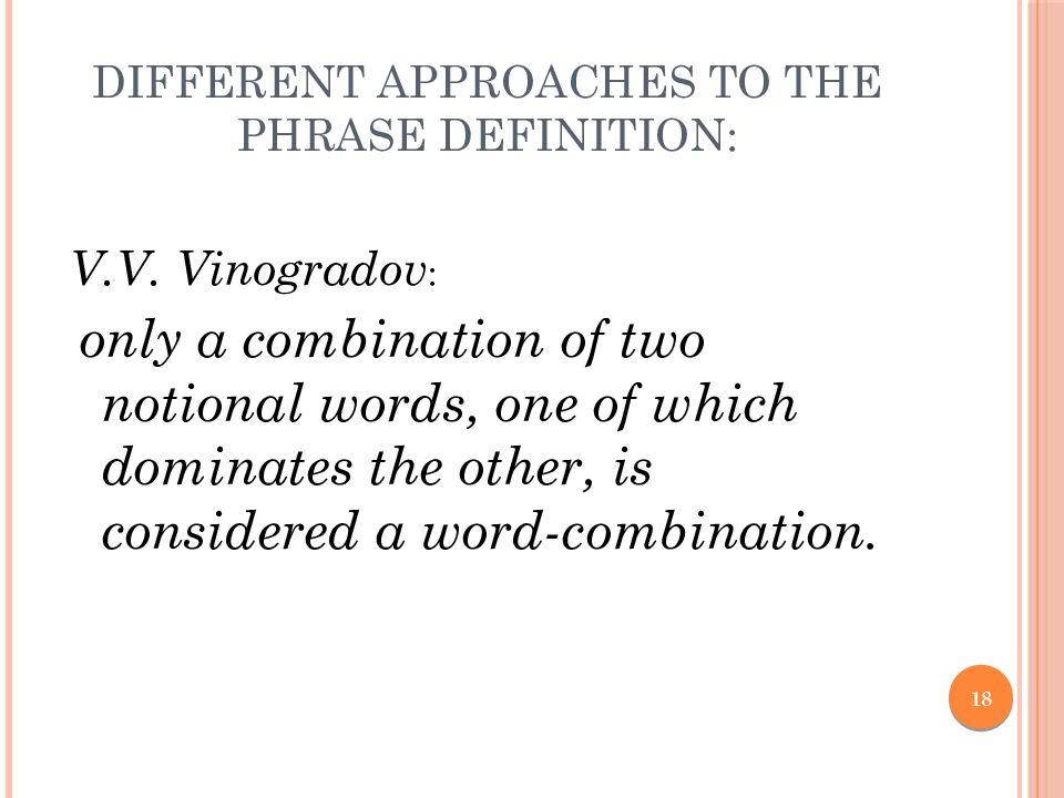 V.V. Vinogradov : only a combination of two notional words, one of which dominates the other, is considered a word-combination. 18