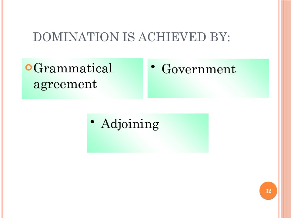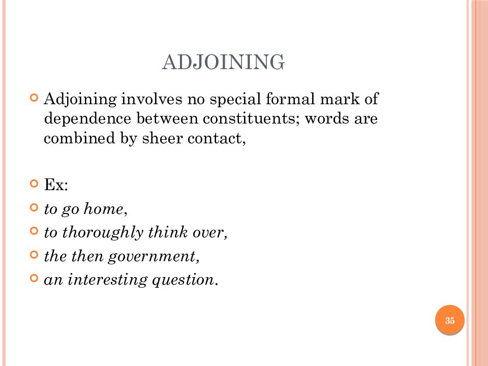 Adjoining involves no special formal mark of dependence between constituents ; words are combined by sheer contact, Ex: to go home, to thoroughly think over, the then government, an interesting question. 35