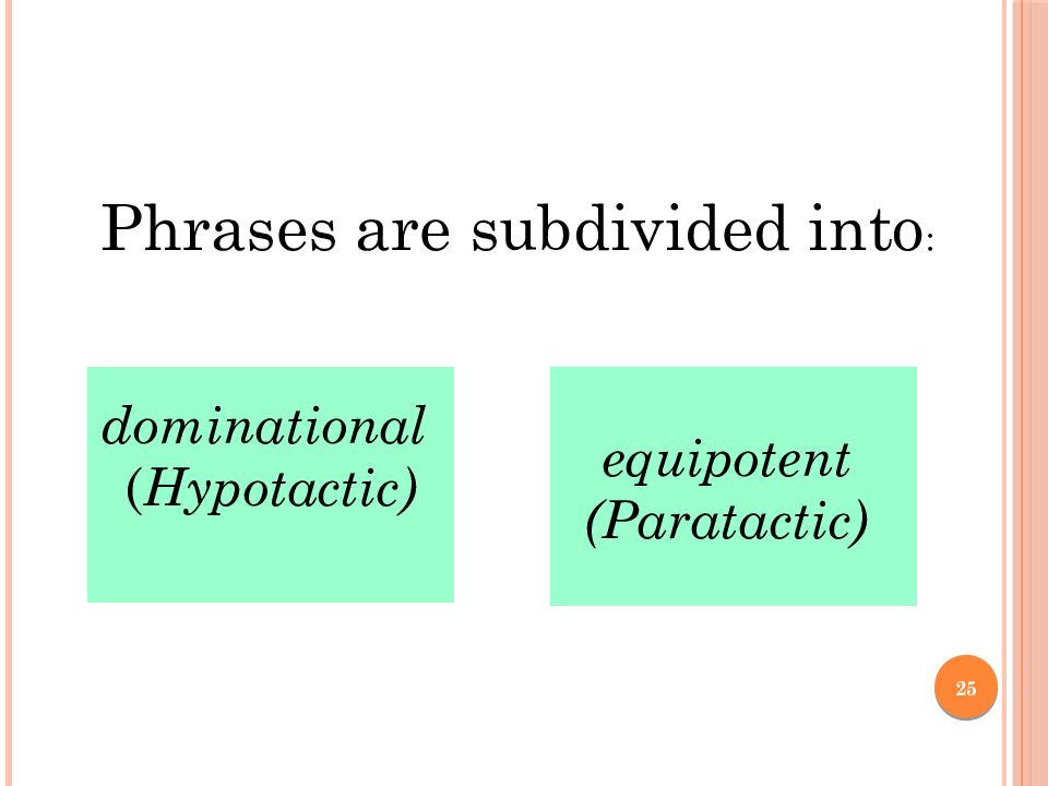 P hrases are subdivided into : dominational ( H ypotactic ) equipotent ( Paratactic ) 25