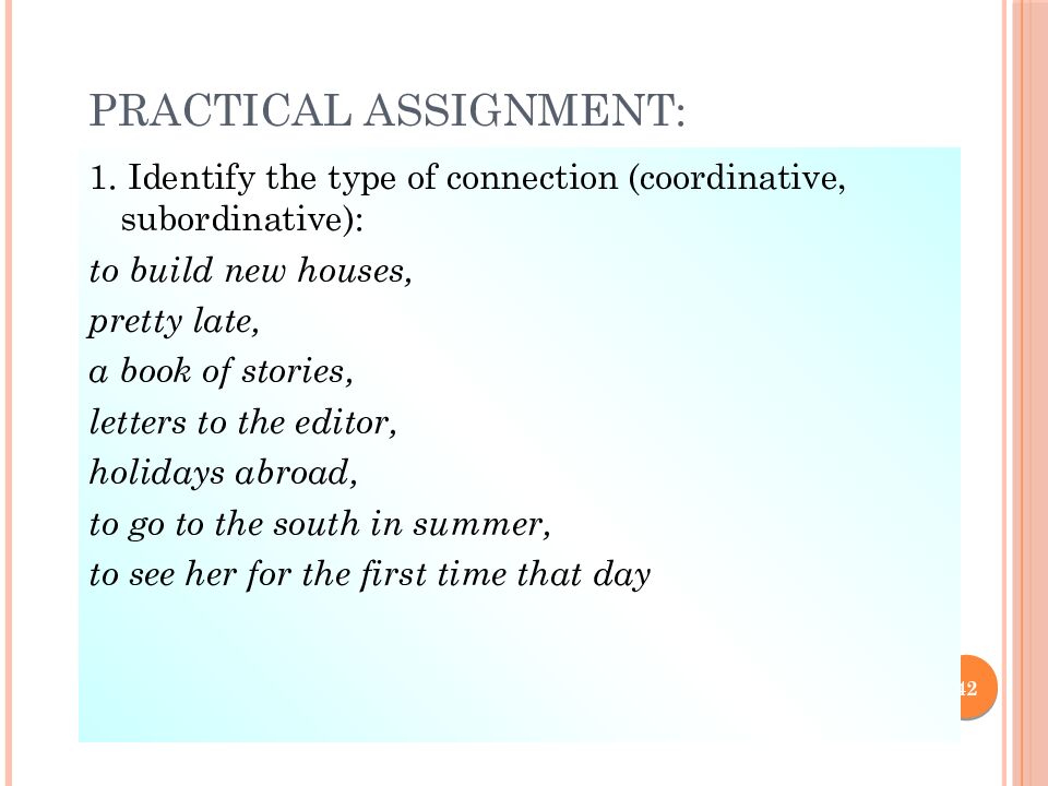 1. Identify the type of connection (coordinative, subordinative ): to build new houses, pretty late, a book of stories, letters to the editor, holidays abroad, to go to the south in summer, to see her for the first time that day 42