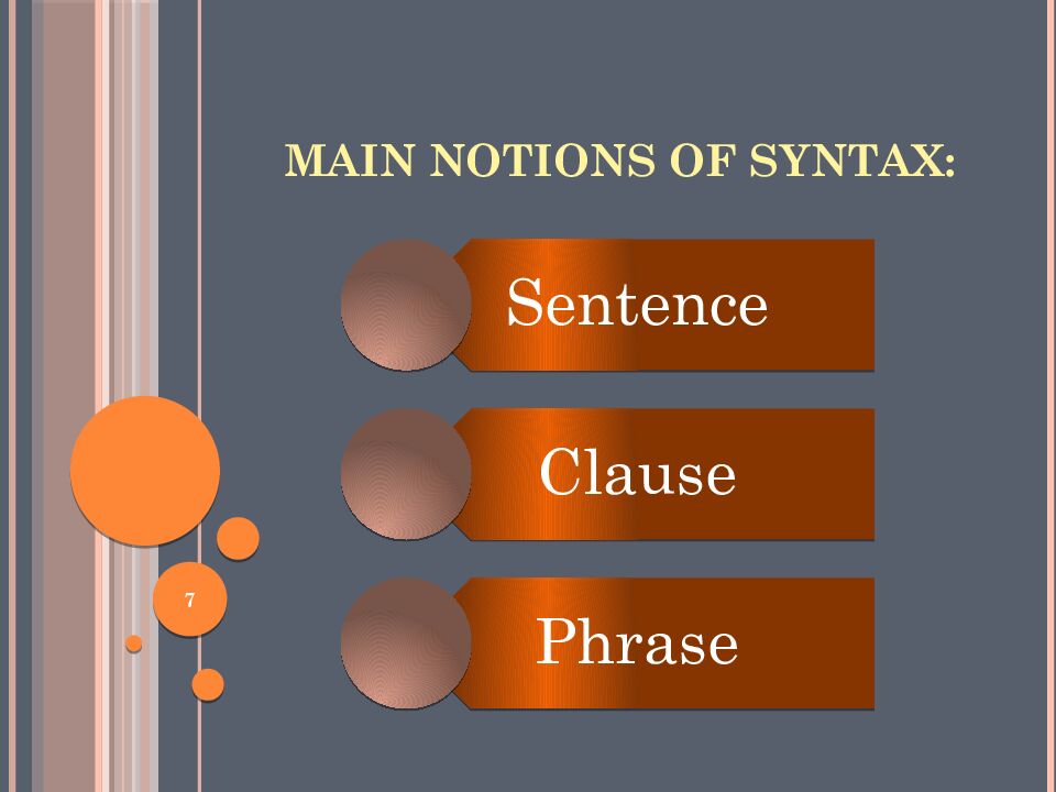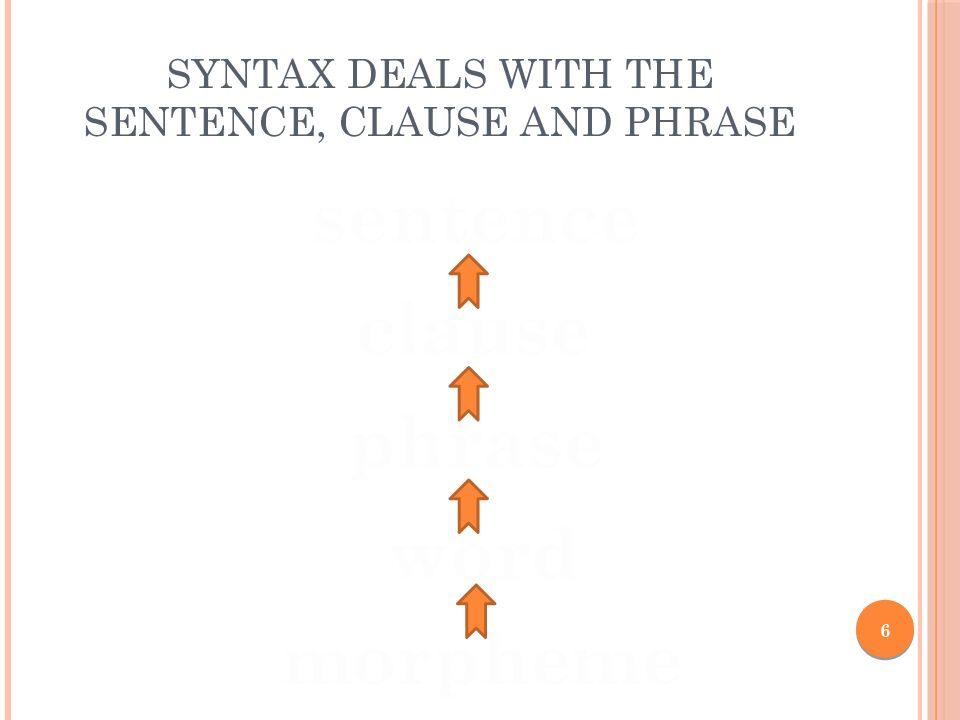 Слайд 6: Syntax deals with the sentence, clause and phrase
