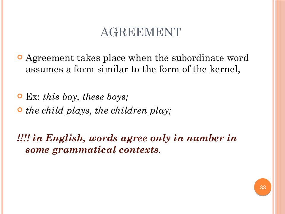 Agreement takes place when the subordinate word assumes a form similar to the form of the kernel, Ex : this boy, these boys ; the child plays, the children play ; !!!! in English, words agree only in number in some grammatical contexts. 33