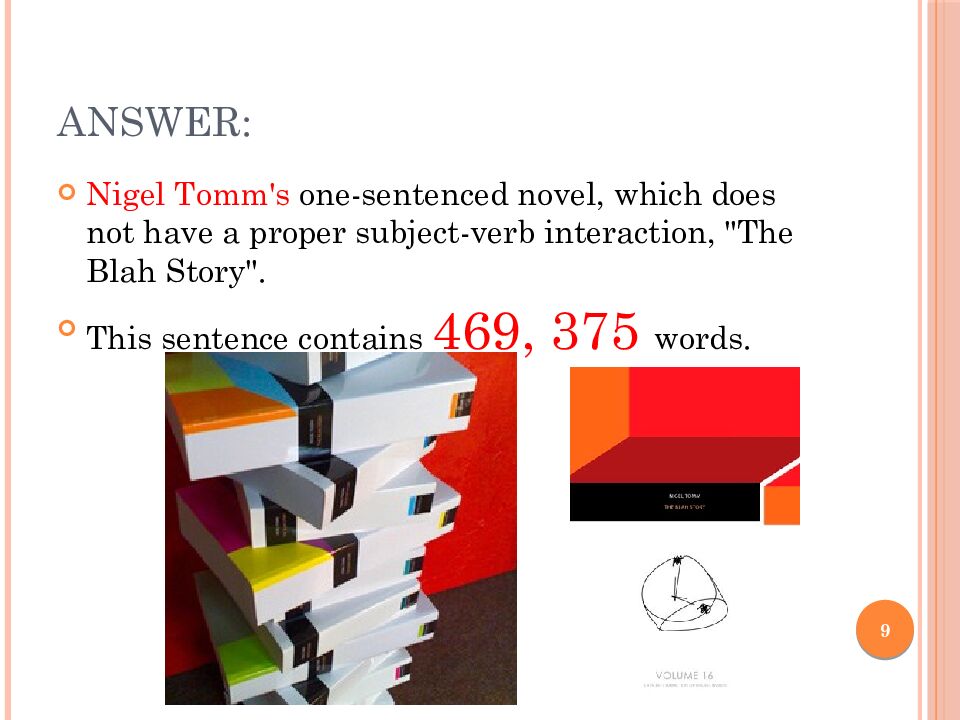Nigel Tomm's one-sentenced novel, which does not have a proper subject-verb interaction, "The Blah Story". This sentence contains 469, 375 words. 9