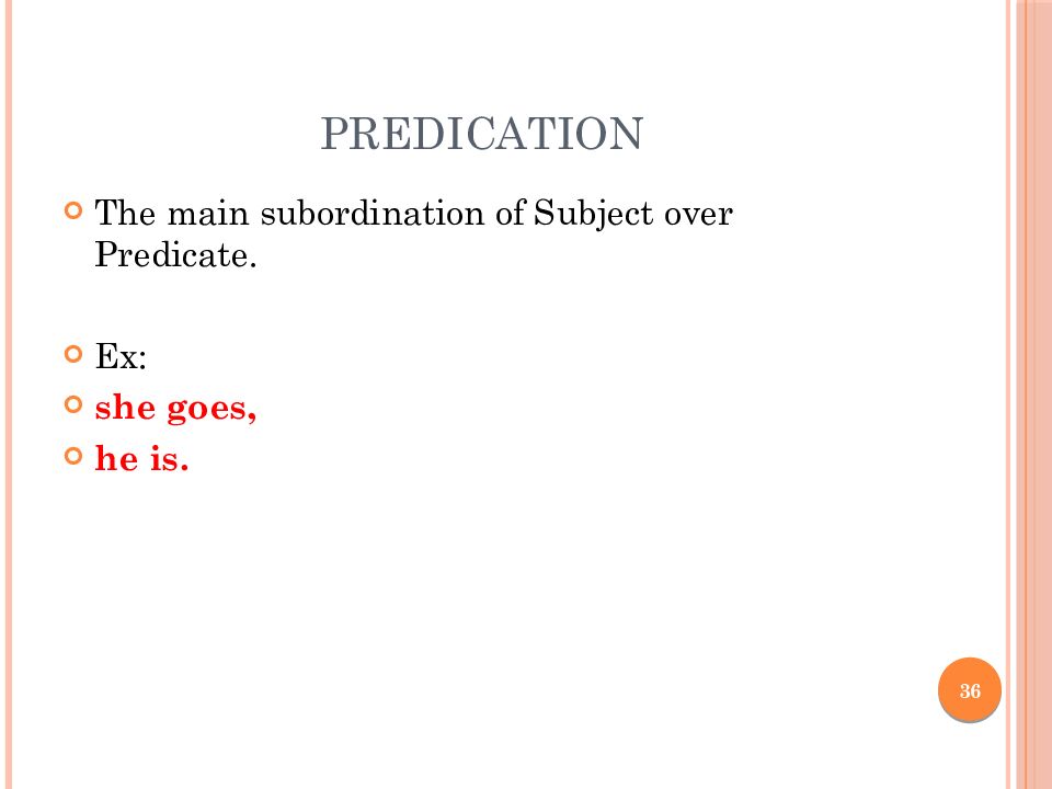 The main subordination of Subject over Predicate. Ex: she goes, he is. 36