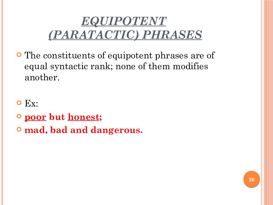 The constituents of equipotent phrases are of equal syntactic rank ; none of them modifies another. Ex : poor but honest ; mad, bad and dangerous. 26