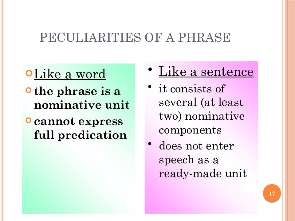 Like a word the phrase is a nominative unit cannot express full predication Like a sentence it consist s of several ( at least two ) nominative components does not enter speech as a ready-made unit 17
