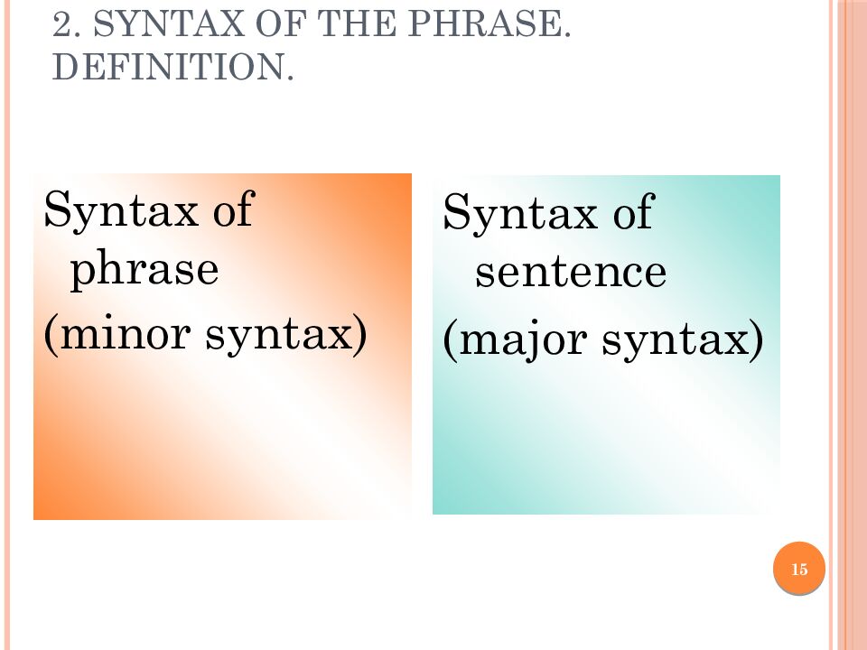 Syntax of phrase (minor syntax) Syntax of sentence (major syntax) 15
