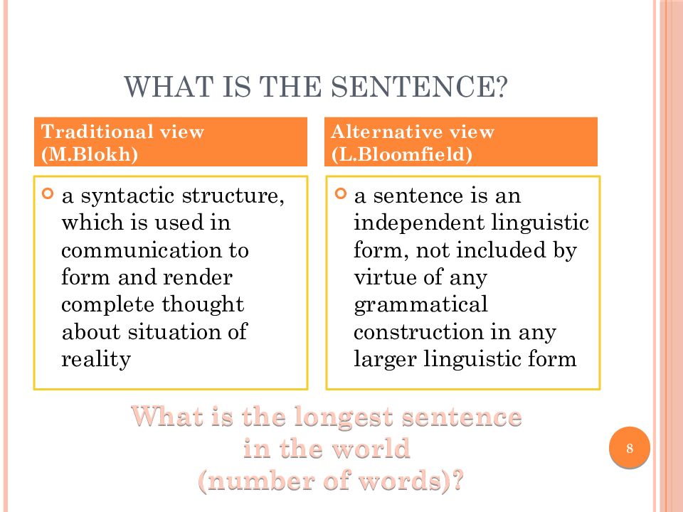 a syntactic structure, which is used in communication to form and render complete thought about situation of reality a sentence is an independent linguistic form, not included by virtue of any grammatical construction in any larger linguistic form Traditional view ( M.Blokh ) Alternative view ( L.Bloomfield ) What is the longest sentence in the world (number of words)? 8
