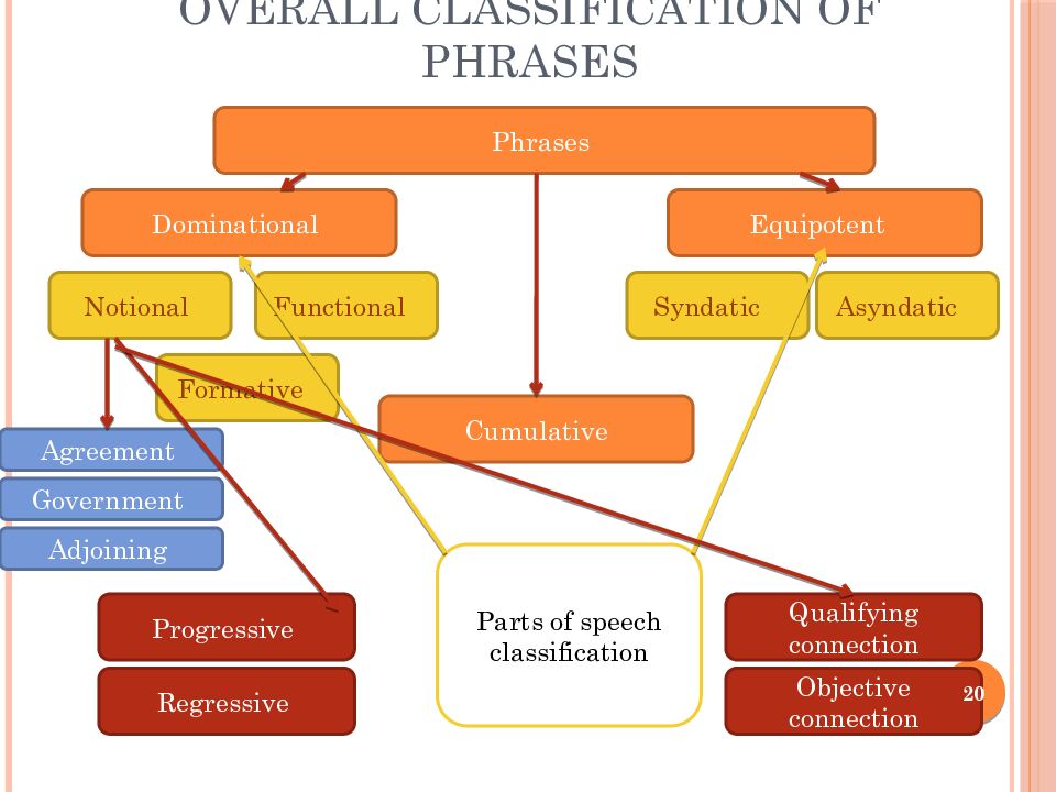 Phrases Dominational Equipotent Notional Formative Functional Syndatic Asyndatic Cumulative Agreement Government Adjoining Progressive Regressive Parts of speech classification Qualifying connection Objective connection 20