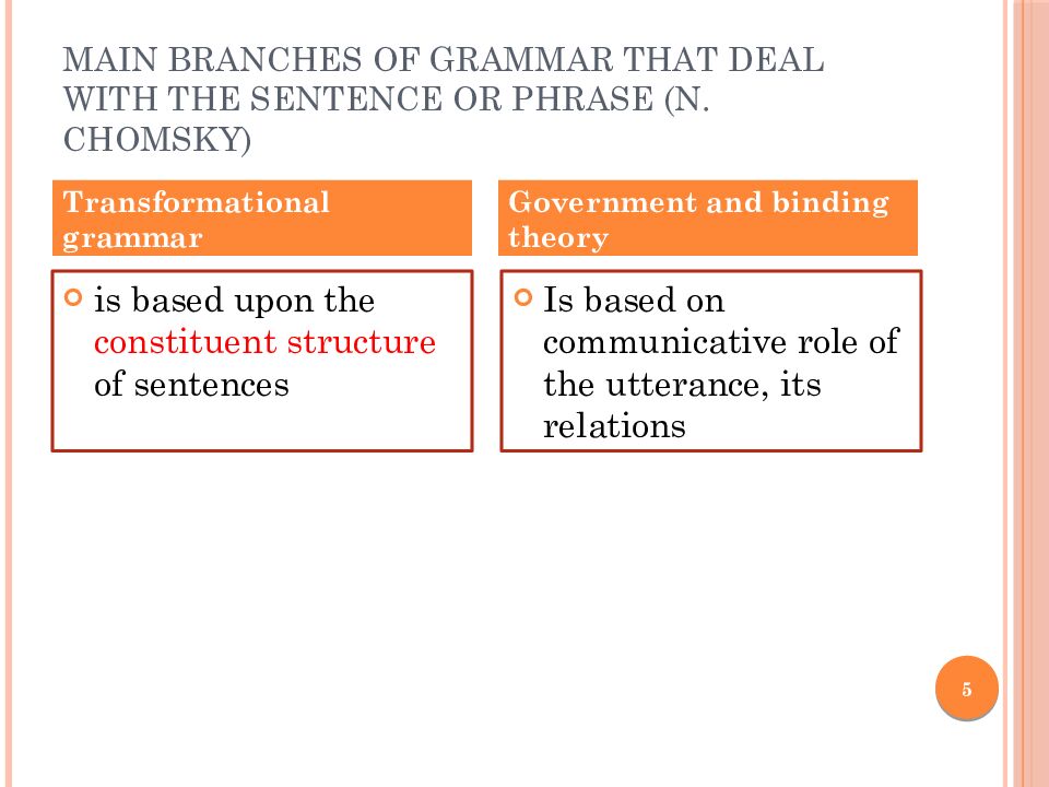 is based upon the constituent structure of sentences Is based on communicative role of the utterance, its relations Transformational grammar Government and binding theory 5