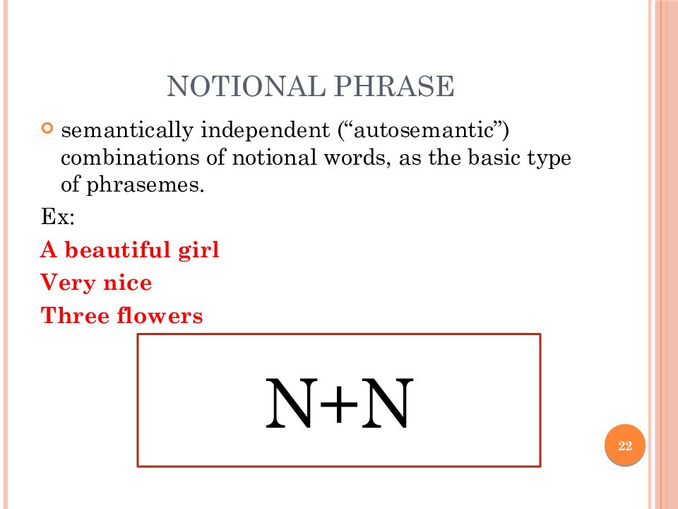 semantically independent (“ autosemantic ”) combinations of notional words, as the basic type of phrasemes. Ex: A beautiful girl Very nice Three flowers N+N 22
