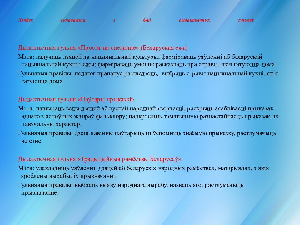 Дыдактычная гульня « Прос i м на снеданне » ( Беларуская ежа) Мэта : далучаць дзяцей да нацыянальнай культуры; фарм i раваць уяўленні аб беларускай нацыянальнай кухн i i ежы ; фарм i раваць уменне расказваць пра стравы, як i я гатуюцца дома. Гульнявыя прав i лы : педагог прапануе разгледзець, выбраць стравы нацыянальнай кухн i, як i я гатуюцца дома. Дыдактычная гульня « Паўтары прыказк i » Мэта : пашыраць веды дзяцей аб вуснай народнай творчасц i ; раскрыць асабл i васц i прыказак – аднаго з асноўных жанраў фальклору ; падкрэсл i ць тэматычную разнастайнасць прыказак, i х павучальны характар. Гульнявыя прав i лы : дзец i пав i нны паўтарыць ц i ўспомн i ць знаёмую прыказку, растлумачыць яе сэнс. Дыдактычная гульня « Традыцыйныя рамёствы Беларусаў » Мэта : удакладн i ць уяўленн i дзяцей аб беларуск i х народных рамёствах, матэрыялах, з як i х зроблены вырабы, іх прызначэнн i. Гульнявыя прав i лы : выбраць выяву народнага вырабу, назваць яго, растлумачыць прызначэнне.
