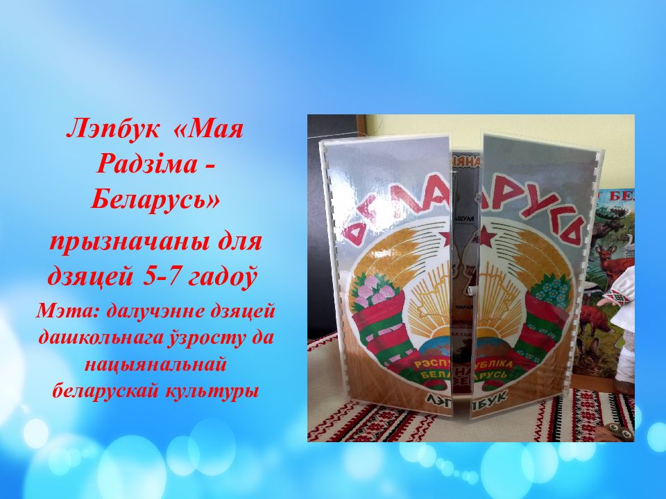 Лэпбук «Мая Радз i ма - Беларусь» прызначаны для дзяцей 5-7 гадоў Мэта : далучэнне дзяцей дашкольнага ўзросту да нацыянальнай беларускай культуры