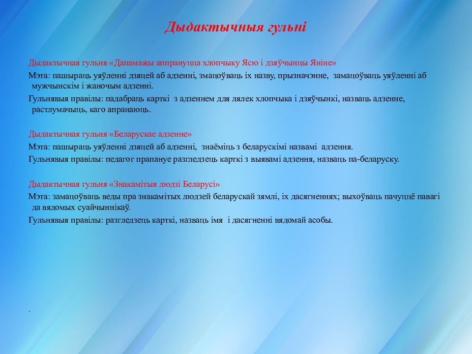 Дыдактычная гульня « Дапамажы аппрануцца хлопчыку Ясю i дзяўчынцы Ян iне » Мэта: пашыр а ць уяўленн i дзяцей аб адзенн i, змац оўваць i х назву, прызначэнне, замацоўваць уяўленн i аб мужчынск i м i жаночым адзенні. Гульнявыя прав i лы : падабраць картк i з адзеннем для лялек хлопчыка i дзяўчынк i, назваць адзенне, растлумачыць, каго апранаюць. Дыдактычная гульня « Беларускае адзенне » Мэта: пашыраць уяўленн i дзяцей аб адзенн i, знаём i ць з беларуск i м i назвам i адзення. Гульнявыя прав i лы : педагог прапануе разгледзець картк i з выявам i адзення, назваць па- беларуску. Дыдактычная гульня «Знакам i тыя людз i Беларус i » Мэта : замацоўваць веды пра знакам i тых людзей беларускай зямл i, i х дасягненнях ; выхо ў ваць пачуццё павагi да вядомых суайчыннiка ў. Гульнявыя прав i лы : разгледзець картк i, назваць i мя i дасягненн i вядомай асобы. .