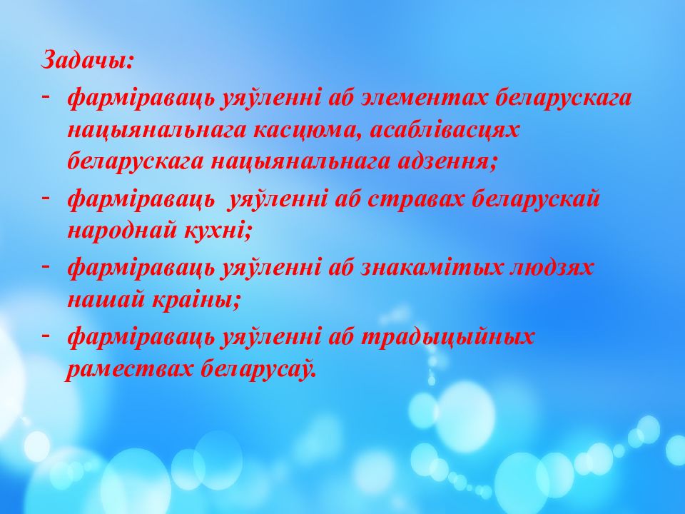 Задачы : фарм i раваць уяўленн i аб элементах беларускага нацыянальнага касцюма, асабл i васцях беларускага нацыянальнага адзення ; фарм i раваць уяўленн i аб стравах беларускай народнай кухн i ; фарм i раваць уяўленн i аб знакам i тых людзях нашай кра i ны ; фарм i раваць уяўленн i аб традыцыйных рамествах беларусаў.