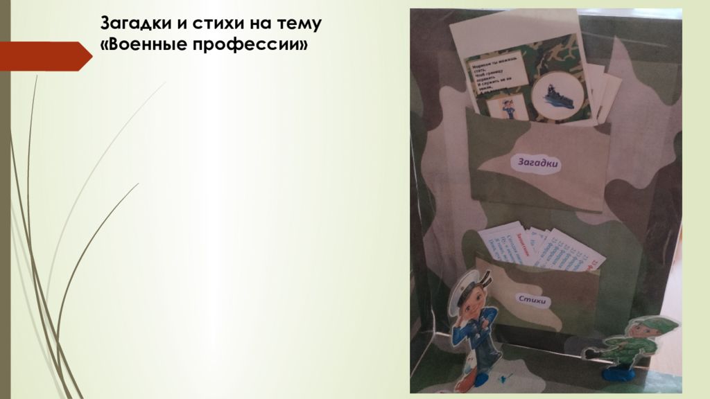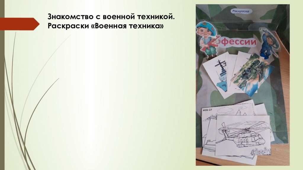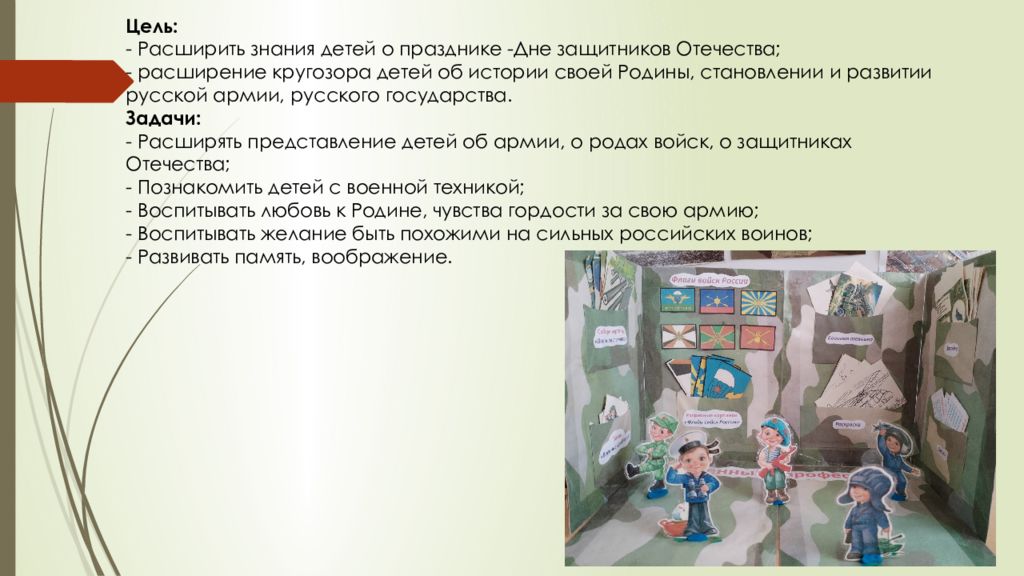 Цель: - Расширить знания детей о празднике -Дне защитников Отечества; - расширение кругозора детей об истории своей Родины, становлении и развитии русской армии, русского государства. Задачи: - Расширять представление детей об армии, о родах войск, о защитниках Отечества; - Познакомить детей с военной техникой; - Воспитывать любовь к Родине, чувства гордости за свою армию; - Воспитывать желание быть похожими на сильных российских воинов; - Развивать память, воображение.
